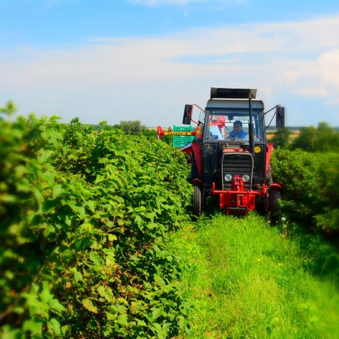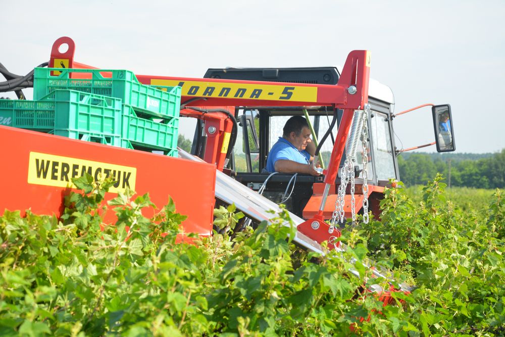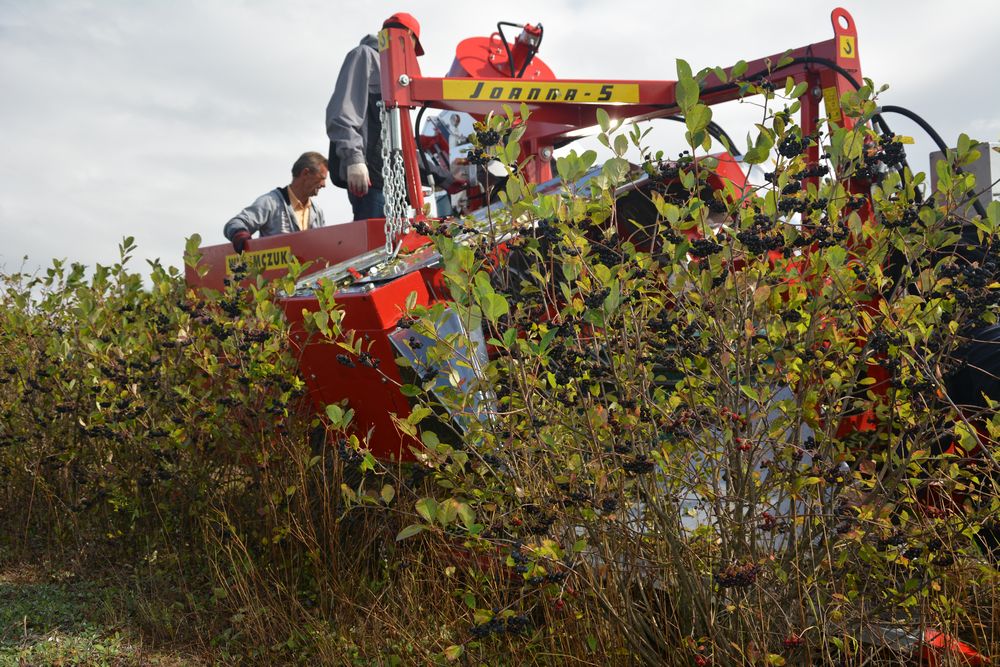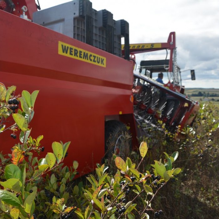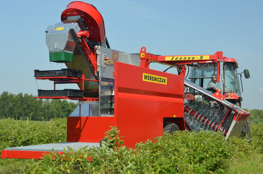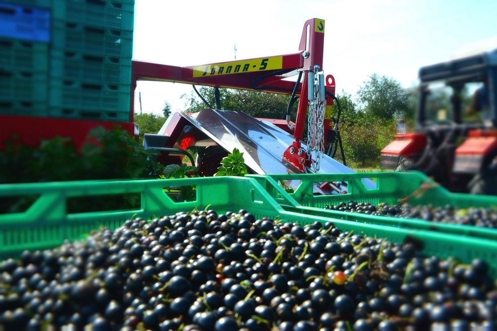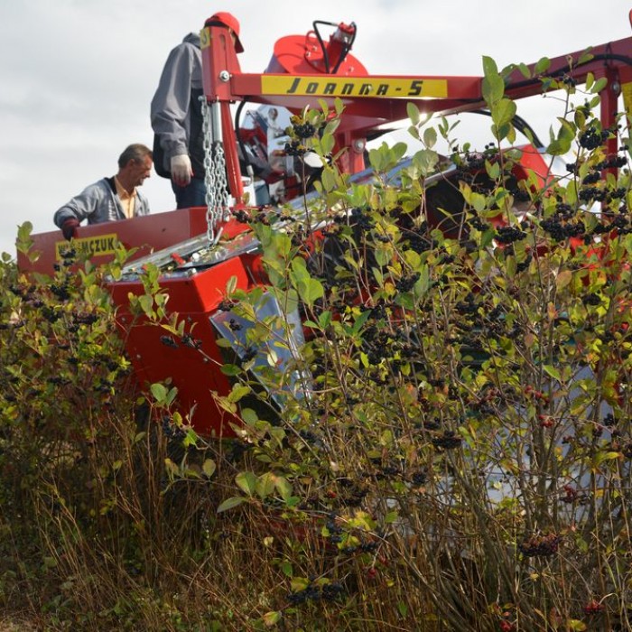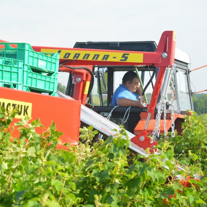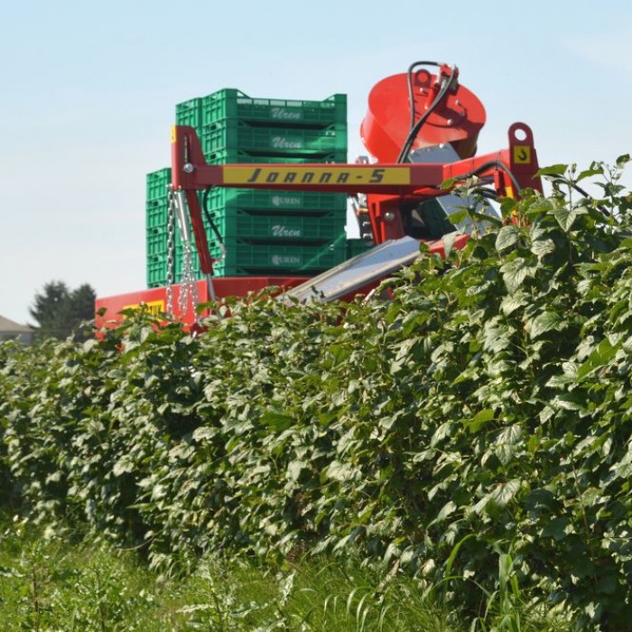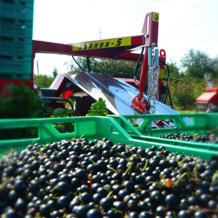 Прицепной комбайн JOANNA-5 предназначен для сбора черной, красной смородины, крыжовника, черноплодной рябины, облепихи, шиповника, жимолости (опциональное оборудование), осенних сортов малины (опциональное оборудование) и других кустарниковых ягод, возделываемых на плантациях, приспособленных для механической уборки комбайном с высотой кустов от 120 до 350 см. и шириной ряда от 20 до 70 см. Опционально возможна установка оборудования для сбора ягод с низкорослых ( от 20 см.) кустов. Главной особенностью комбайна является то, что он идеально подходит для работы с высокими и густыми кустами. Комбайн JOANNA-5 является полурядным комбайном и снабжен системой уборки ягод, основанной на одном стряхивателе с универсальной, регулируемой для всех типов ягодных кустов, головкой - что гарантирует 100% эффективность при минимальных потерях. Комбайн имеет однородную, широкую и удобную рабочую платформу, снабженную со стороны кустарника специальными защитами, предотвращающими попадание листьев в убранные ягоды, а сзади - барьер, предохраняющий ящики с ягодами от падения с платформы. На платформу можно поместить большие 500 кг контейнеры и несколько рядов ящиков. Высоко расположенный над центральным лотком транспортер обеспечивает равномерное рассыпание собранных ягод по всей поверхности контейнера.