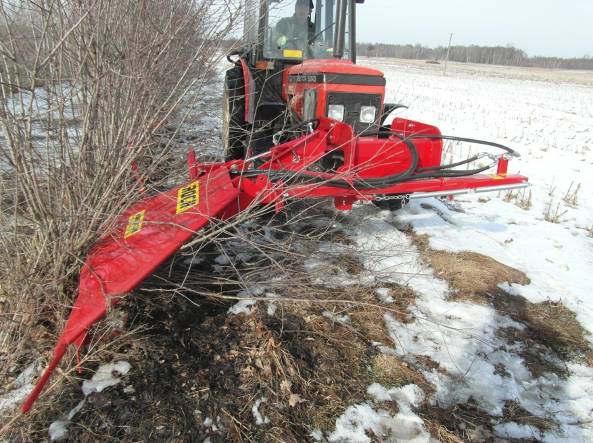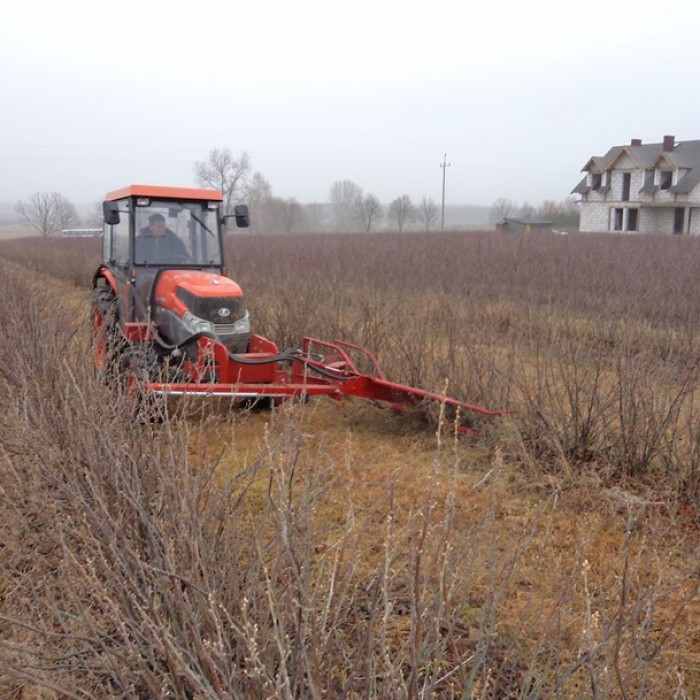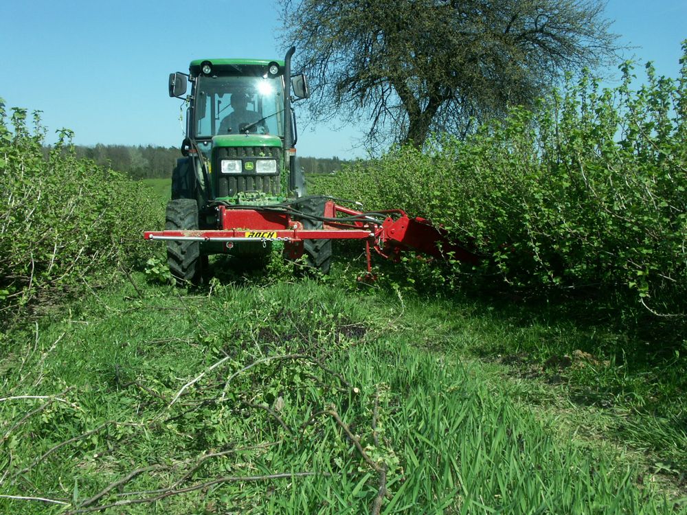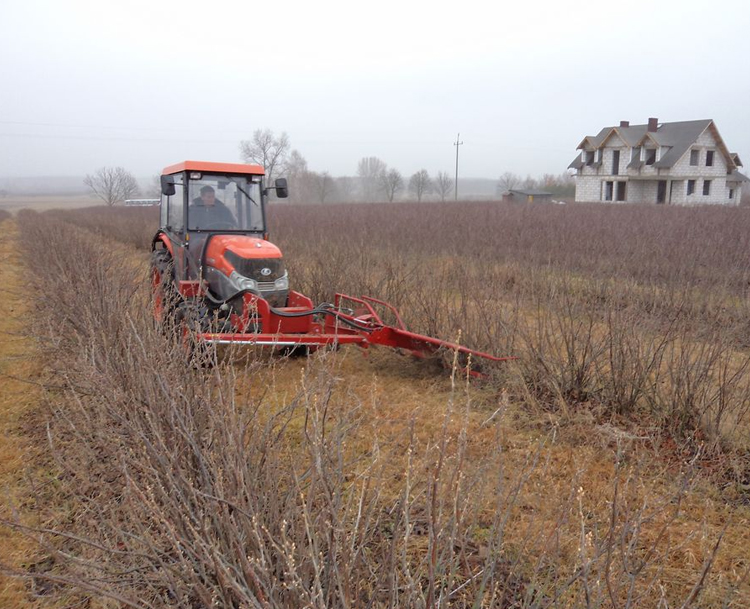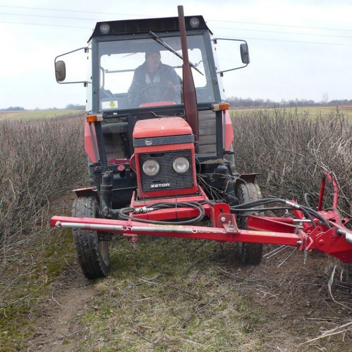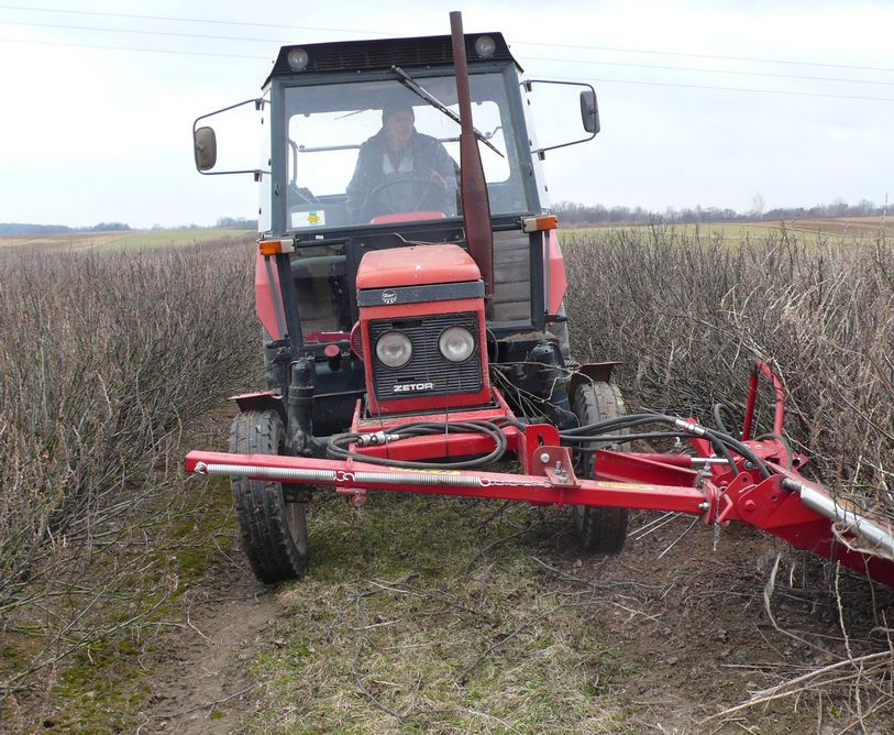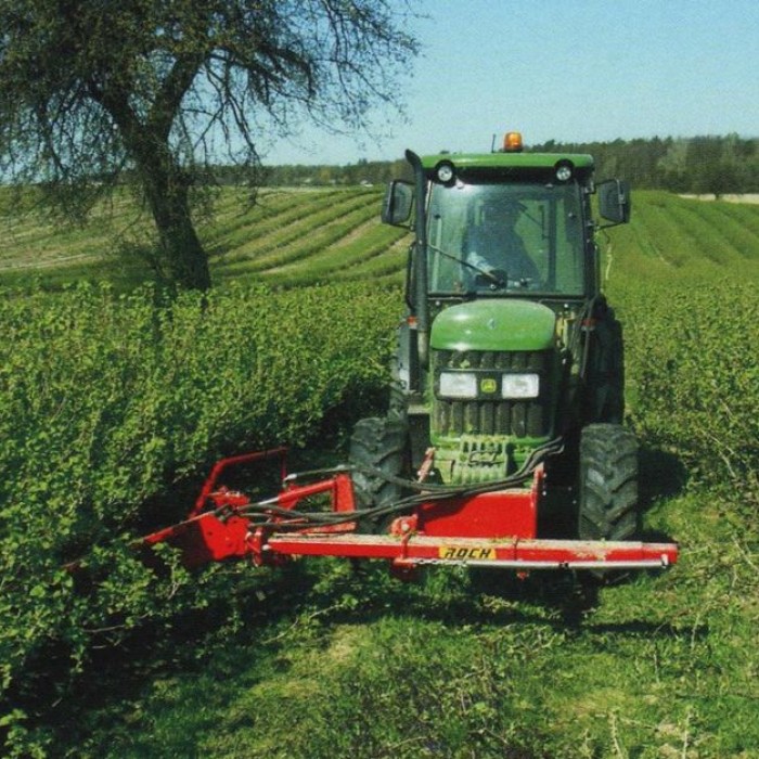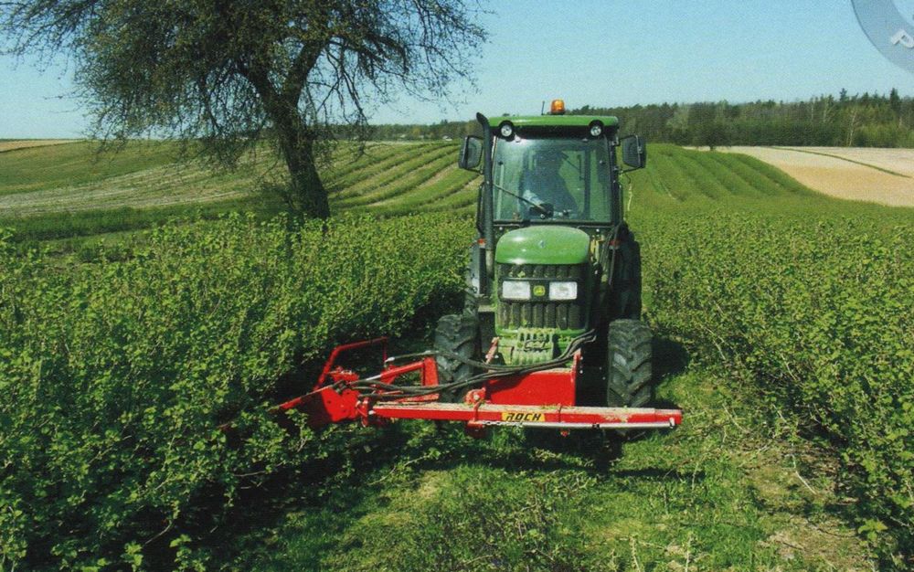 Машина для обрезки побегов смородины ROCH предназначена для ухода за плантациями смородины – для вырезки целых побегов смородины у их основания. Не оставляет загрязнений. Обеспечивает точную установку высоты вырезки. Такой способ обрезки побегов предотвращает оставление на плантации больших старых остатков побегов, загрязняющих фрукты во время уборки и блокирующих очищающий вентилятор в уборочном комбайне . Одновременно в плантации остаются живые и плодоностные побеги, а ряды кустов являются хорошо сформированы для уборки ягод. Машина для обрезки побегов ROCH подвешена с правой стороны спереди к раме трактора, чтобы легко контролировать процесс вырезки. Примененная направляющая полозьев вместе с распределителями ветвей позволяет точно установить высоту вырезки