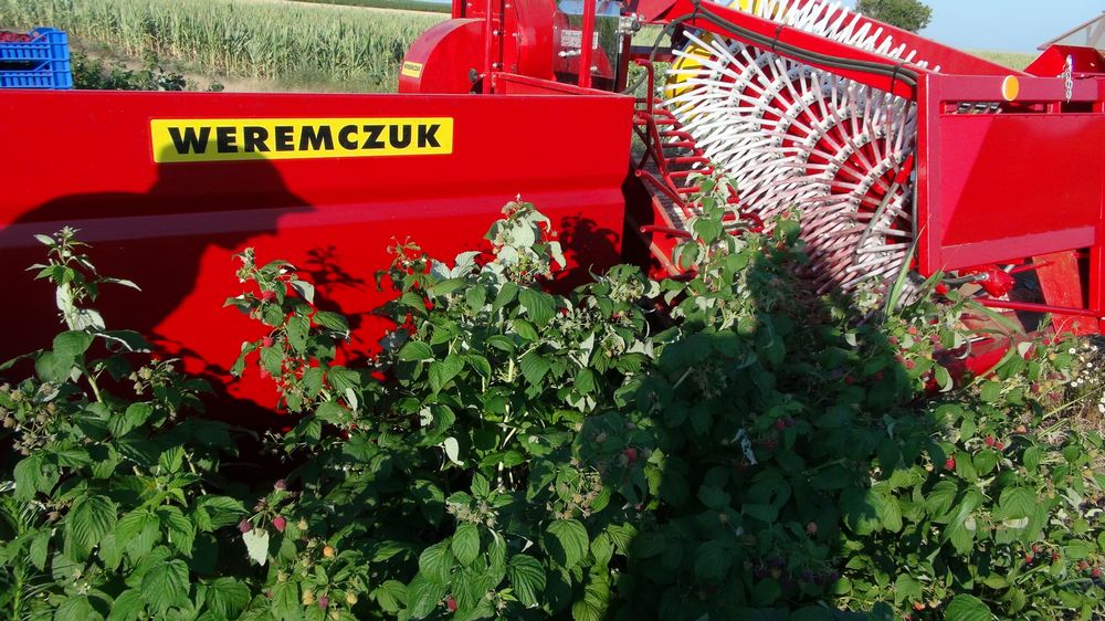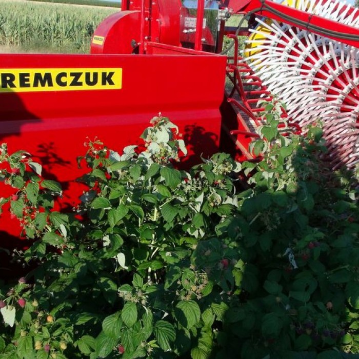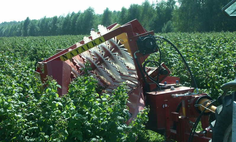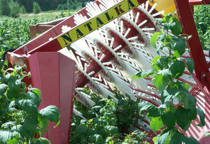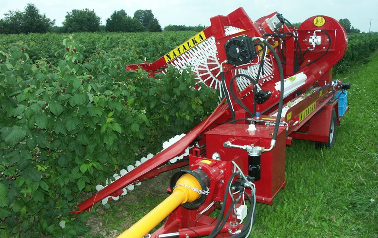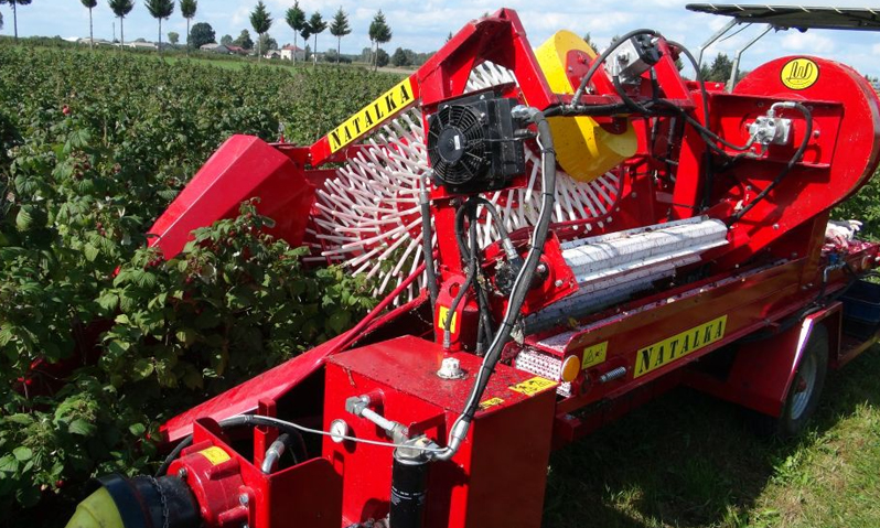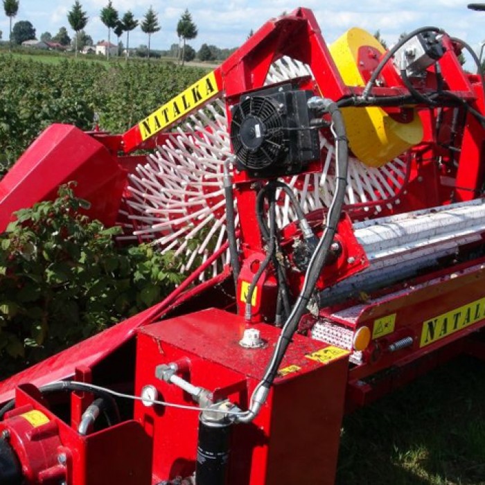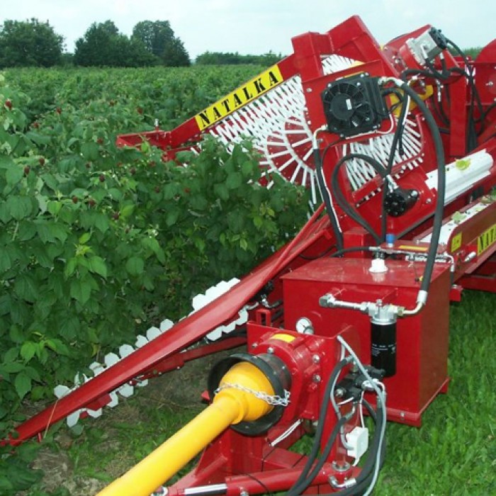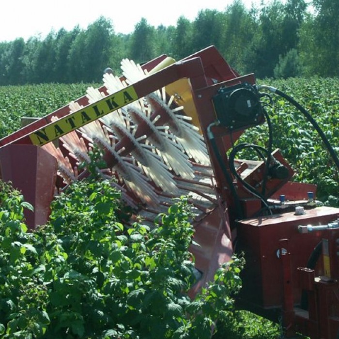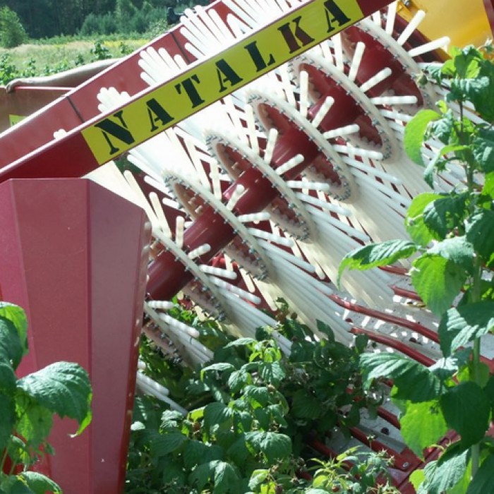 NATALKA полурядный прицепной комбайн для уборки ремонтантной малины с кустарников без подпор. Приспособлен к многократной уборке во время плодоношения и может обслуживать плантацию площадью 3-4 га. Гарантирует высококачественную эффективную уборку малины в сезоне. Комбайн наезжает на ряд малин, разделяя его на половину. При помощи подборщика (при активном подборщике это происходит при помощи двух лент с полками) и распределителя ряда побегов малин вводятся в пространство стряхивания. Малины, падая на транспортеры перемещаются очищающим узлом, затем направляются в установленные ящики. На конце транспортера существует возможность сортировки (отбора некачественных) плодов. Наполненные ящики отбирает и устанавливает на платформе обслуживающее лицо. Чтобы убрать все ягоды следует еще раз въехать в ряд с другой стороны. Собранные ягоды предназначены прежде всего для переработки.