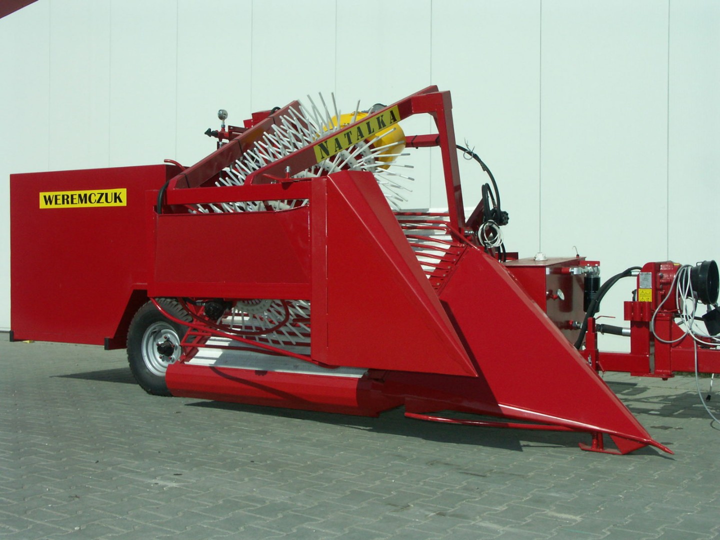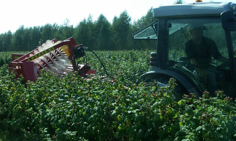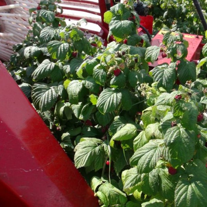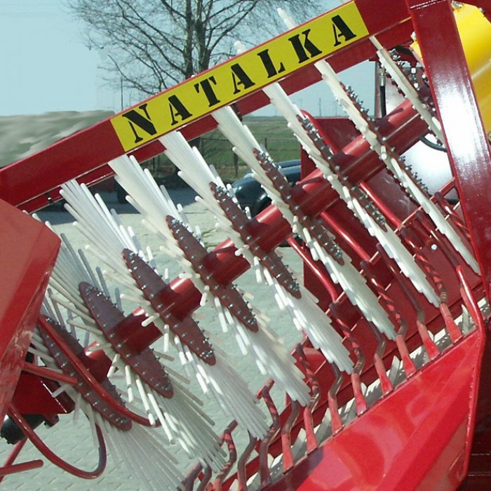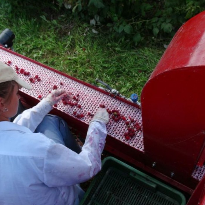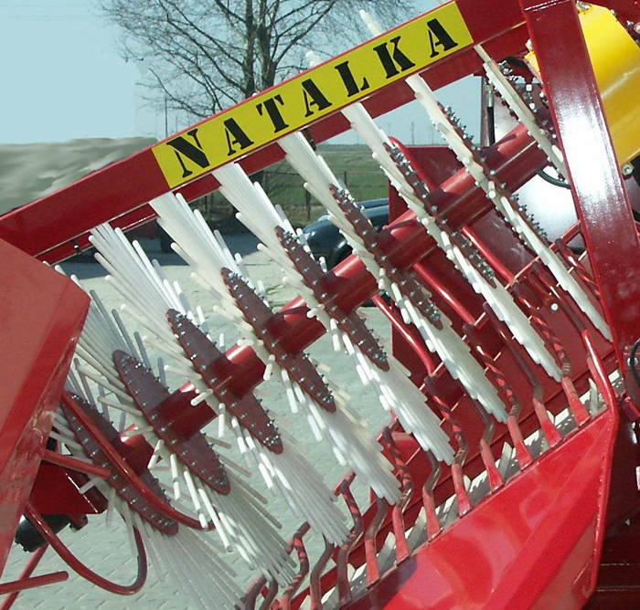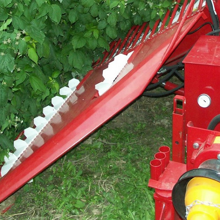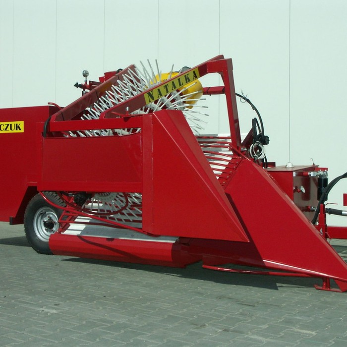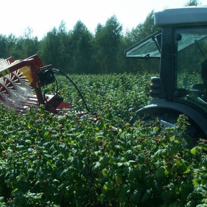 NATALKA полурядный прицепной комбайн для уборки ремонтантной малины с кустарников без подпор. Приспособлен к многократной уборке во время плодоношения и может обслуживать плантацию площадью 3-4 га. Гарантирует высококачественную эффективную уборку малины в сезоне. Комбайн наезжает на ряд малин, разделяя его на половину. При помощи подборщика (при активном подборщике это происходит при помощи двух лент с полками) и распределителя ряда побегов малин вводятся в пространство стряхивания. Малины, падая на транспортеры перемещаются очищающим узлом, затем направляются в установленные ящики. На конце транспортера существует возможность сортировки (отбора некачественных) плодов. Наполненные ящики отбирает и устанавливает на платформе обслуживающее лицо. Чтобы убрать все ягоды следует еще раз въехать в ряд с другой стороны. Собранные ягоды предназначены прежде всего для переработки.