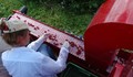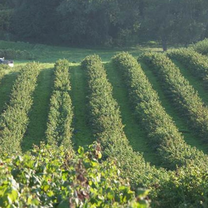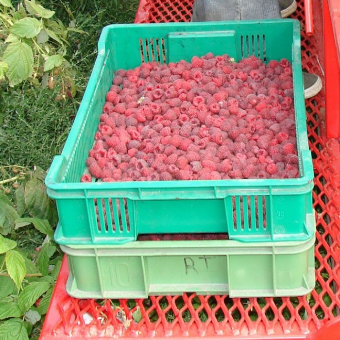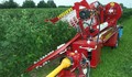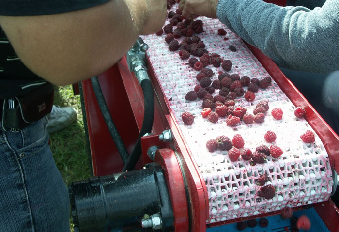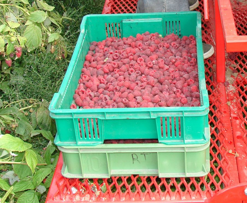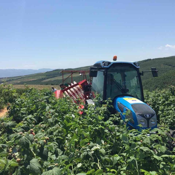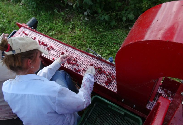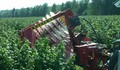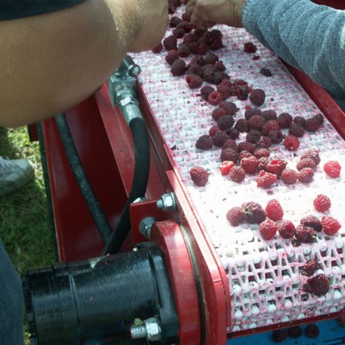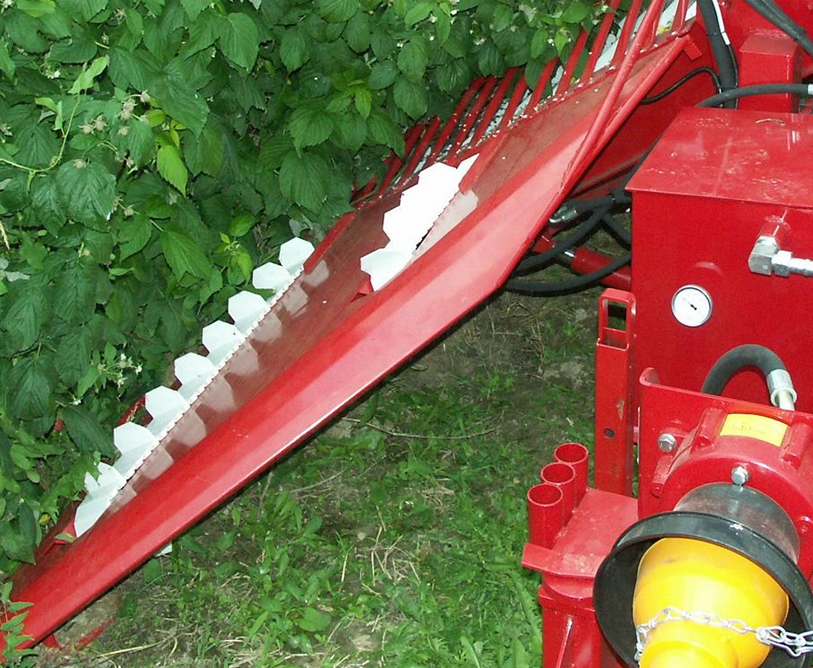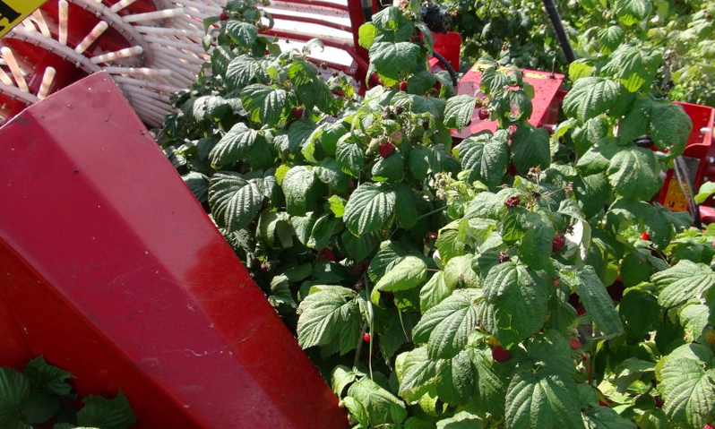 NATALKA полурядный прицепной комбайн для уборки ремонтантной малины с кустарников без подпор. Приспособлен к многократной уборке во время плодоношения и может обслуживать плантацию площадью 3-4 га. Гарантирует высококачественную эффективную уборку малины в сезоне. Комбайн наезжает на ряд малин, разделяя его на половину. При помощи подборщика (при активном подборщике это происходит при помощи двух лент с полками) и распределителя ряда побегов малин вводятся в пространство стряхивания. Малины, падая на транспортеры перемещаются очищающим узлом, затем направляются в установленные ящики. На конце транспортера существует возможность сортировки (отбора некачественных) плодов. Наполненные ящики отбирает и устанавливает на платформе обслуживающее лицо. Чтобы убрать все ягоды следует еще раз въехать в ряд с другой стороны. Собранные ягоды предназначены прежде всего для переработки.